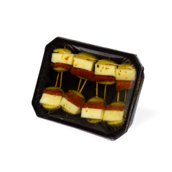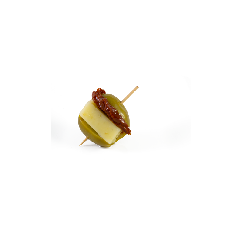 Bomba formada de Aceituna Gordal, queso semicurado zamorano, tomate seco y especias.