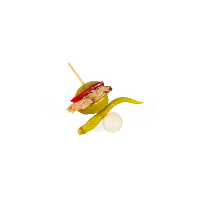 Aceituna Gordal Reina, ventresca de atún, pimiento de piquillo, piparra y cebolleta.