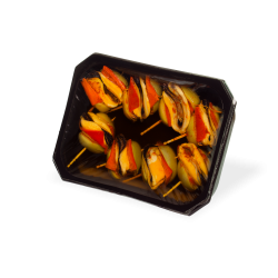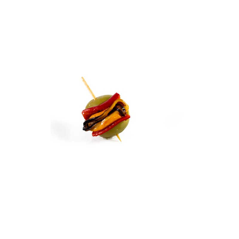 Aceituna Gordal Reina, mejillón macerado y pimiento de piquillo.