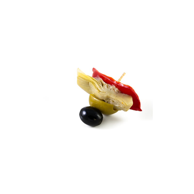 Aceituna Gordal Reina, alcachofa a la romana marinada, pimiento de piquillo, aceituna deshuesada negra y especias.