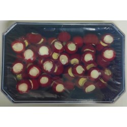 Mini pimientos dulce picantes de sabor afrutado rellenos de crema de queso de rulo de cabra.